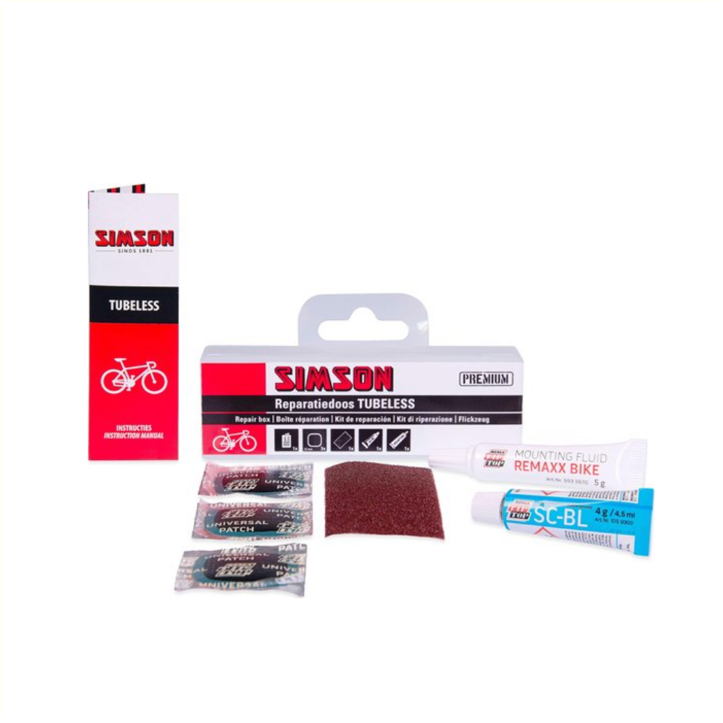 • Contents of the Simson Tubeless repair kit: 3 x Tubeless tire patch 27mm, 1 x tube of blue solution 4g, 1 x tube of Remaxx mounting fluid 5g, 1 x sandpaper, 1 x instructions