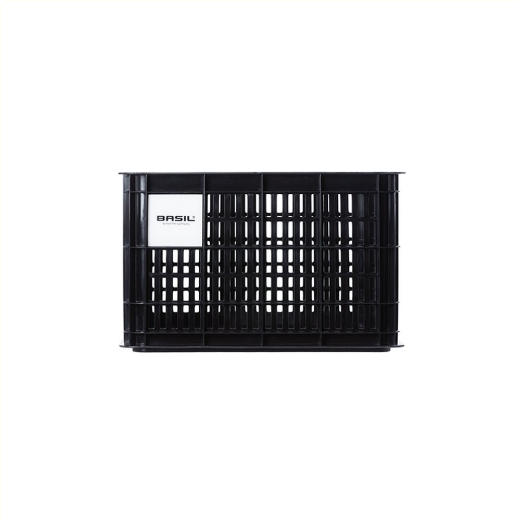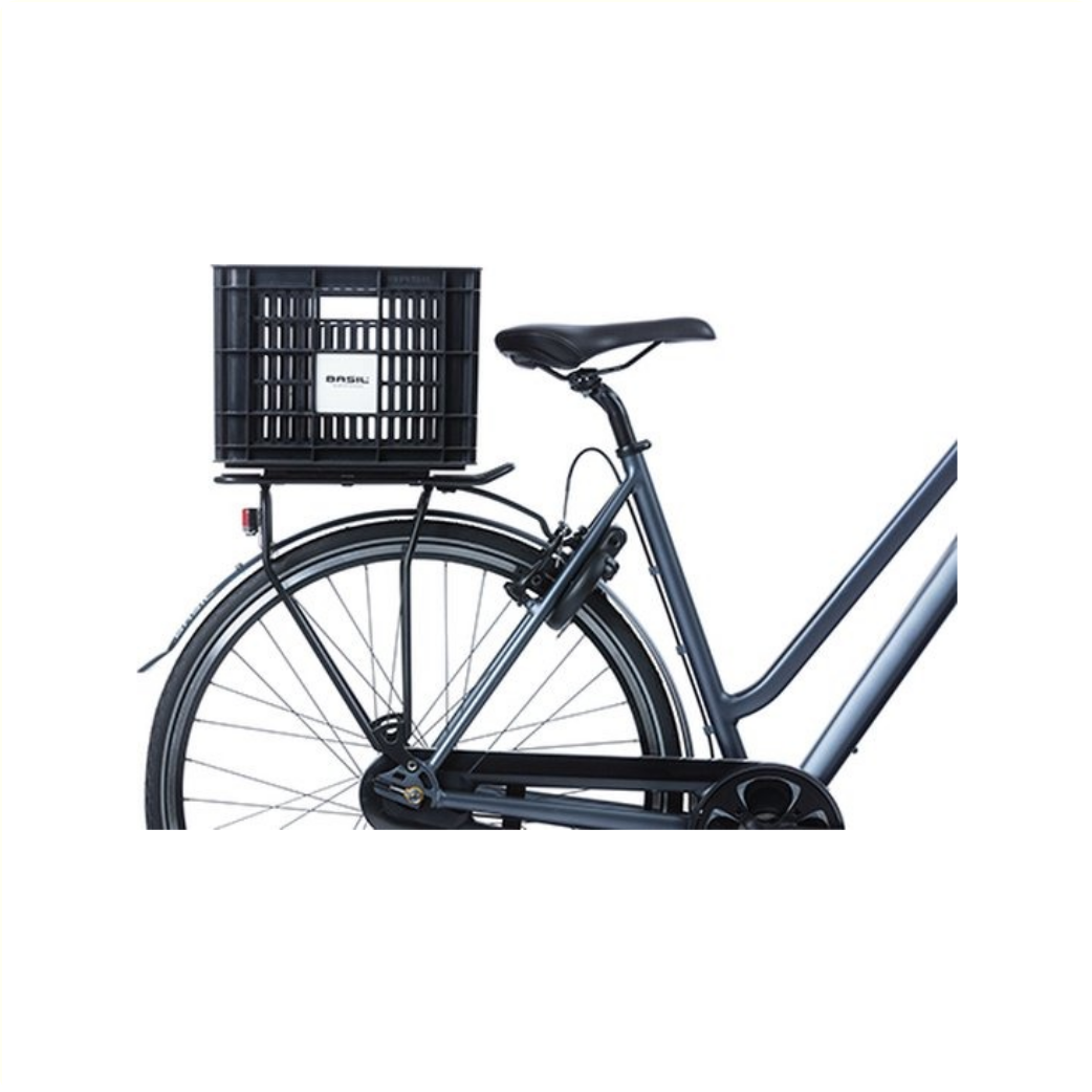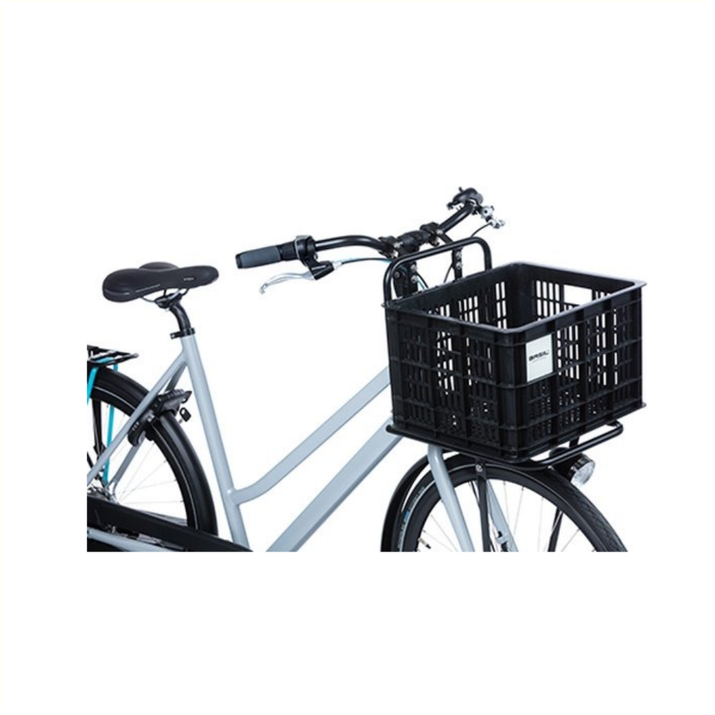 La caisse à vélo Basil de taille M est une caisse à vélo noire pour un vélo pour femme ou pour homme.