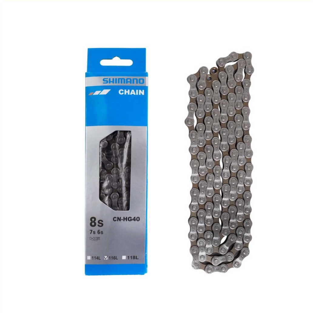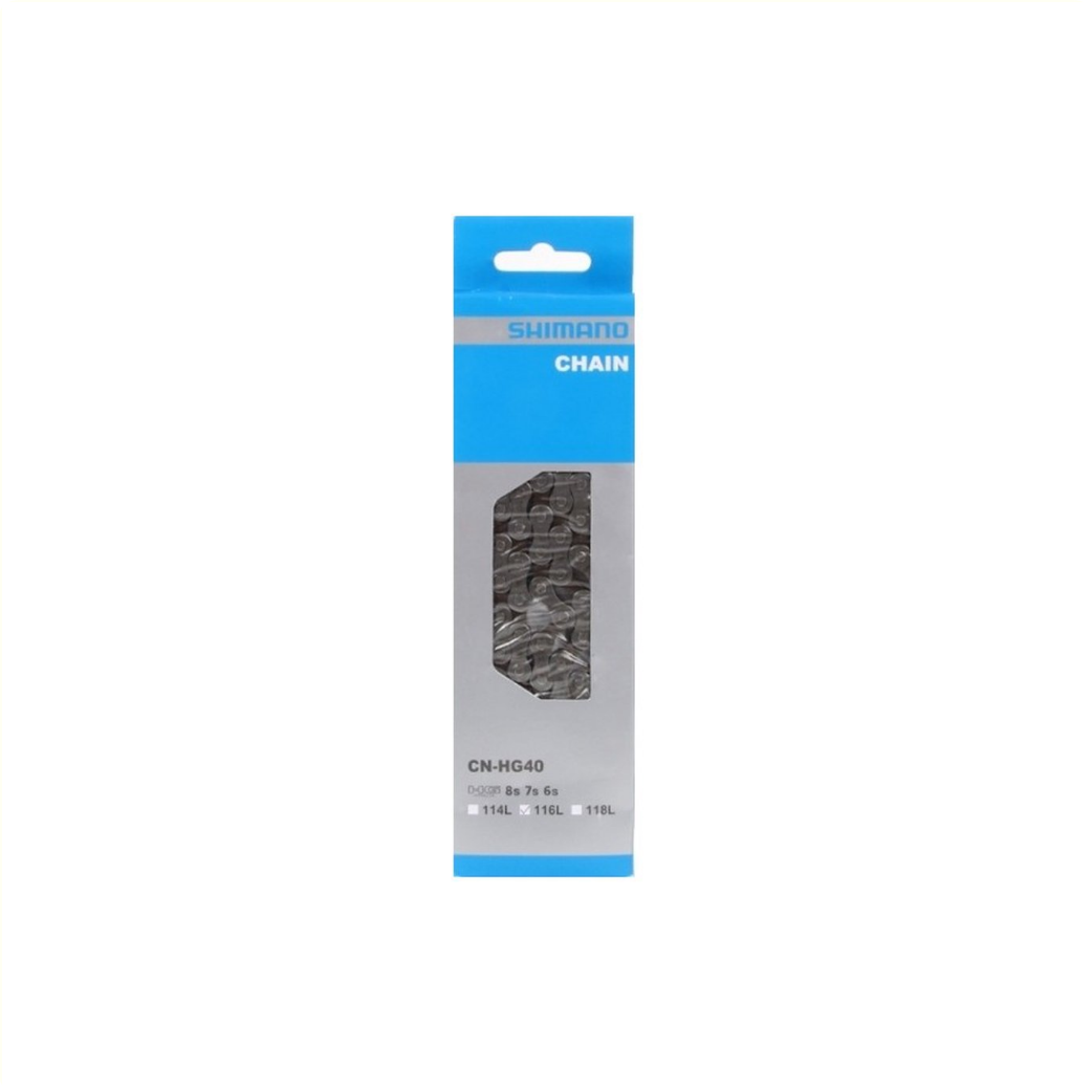 Chaîne Shimano CN-HG40. • Comprend un lien de montage Quick Link • Matériau : Acier • Taille de la chaîne : 1/2 x 3/32" • Nombre de vitesses : 6/7/8 • Nombre de liens : 116 • Poids : 350 grammes • Couleur : Gris • Chaîne compatible avec la série Hyperglide (HG) à 6/7//8 vitesses.