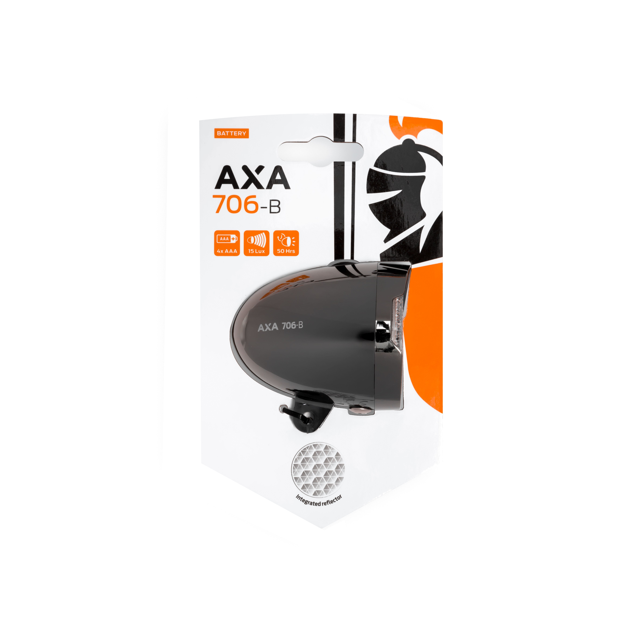 Phare avant Axa 706 B • Lampe LED haute puissance jusqu'à 15 lux • Boîtier aspect chrome foncé • Changement de batterie facile • Comprend 4 piles AAA • Jusqu'à 50 heures d'autonomie de la batterie • Design rétro accrocheur