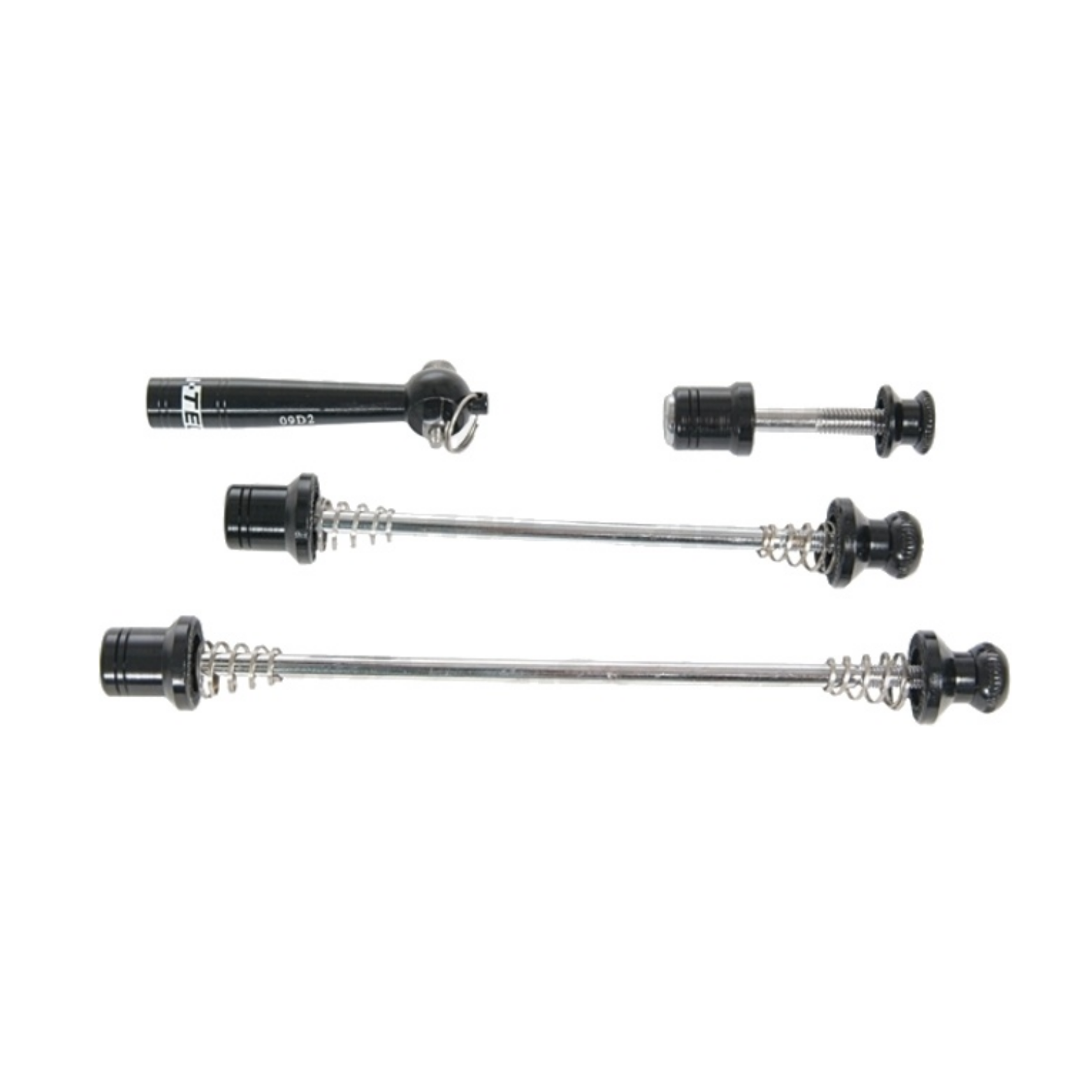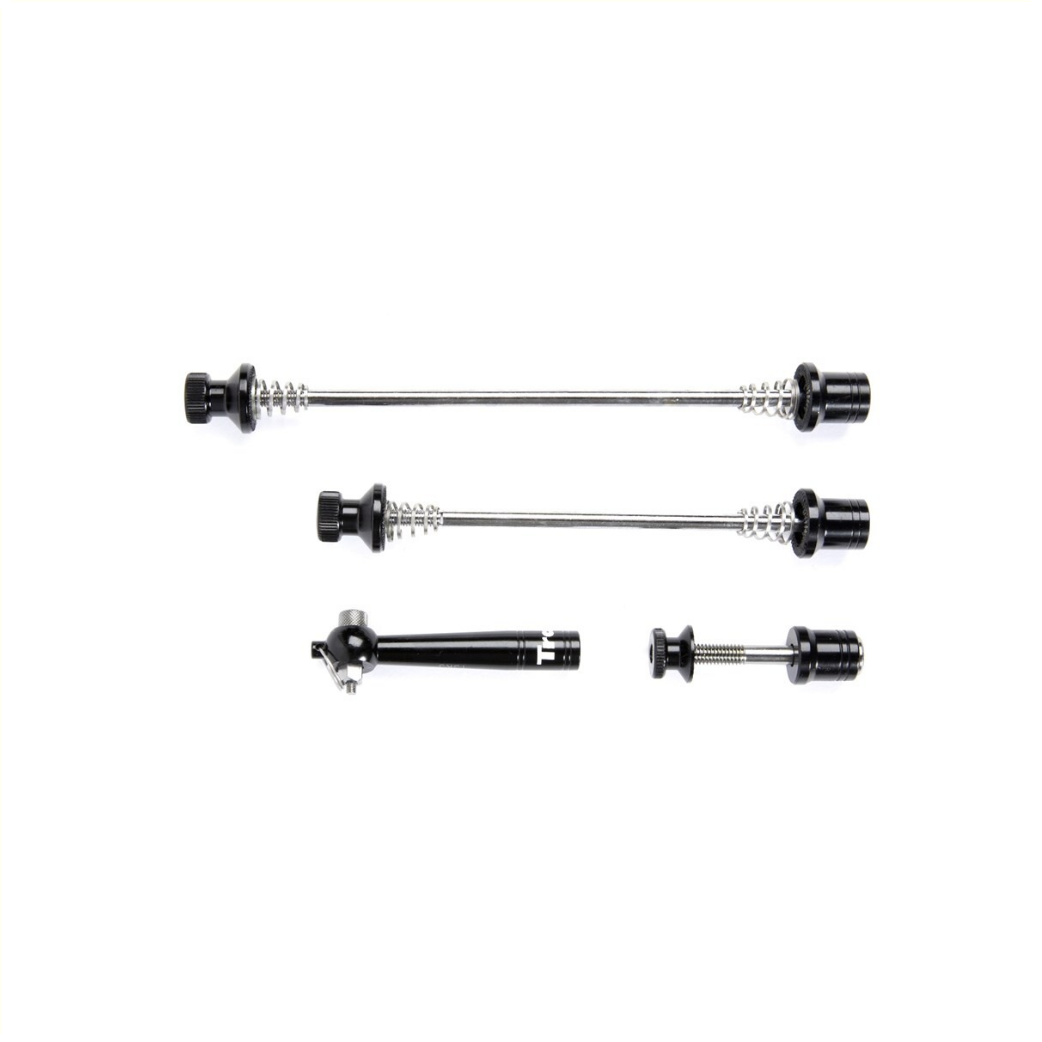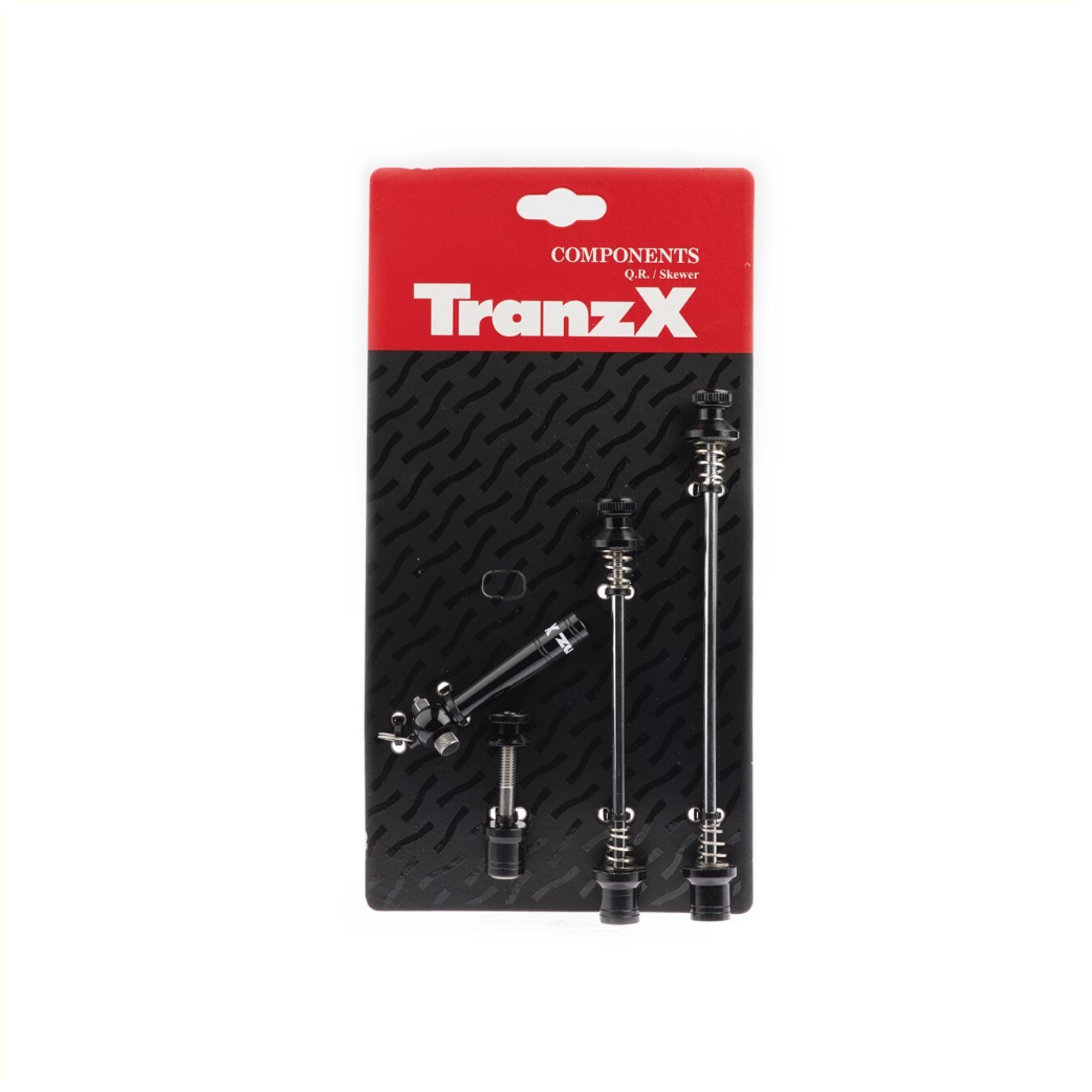 Ensemble complet de fixation rapide de Tranz X pour la roue avant, la roue arrière et la tige de selle. Equipé de boulons Allen antivol spéciaux (clé incluse).