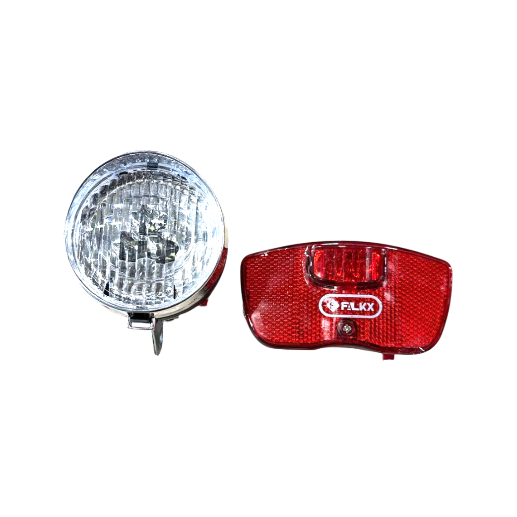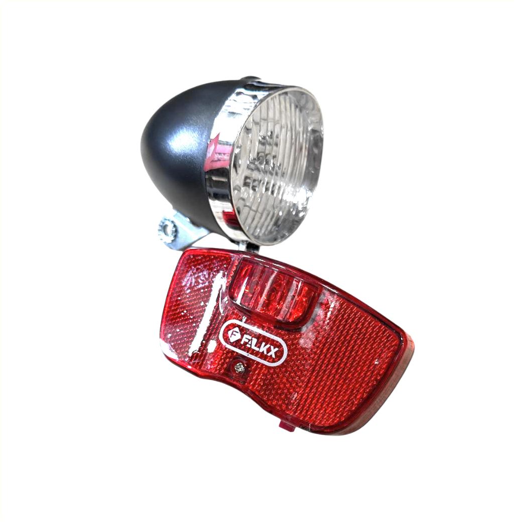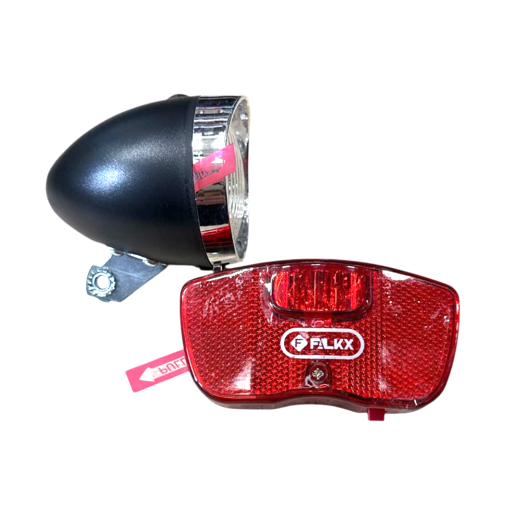 Soyez visible de tous les côtés avec le FALKX Sun Set 1. Ce kit d'éclairage complet est l'accessoire idéal pour votre vélo de ville ou votre vélo utilitaire. Il comprend un phare avant puissant au style rétro et un feu arrière robuste pour porte-bagages.
