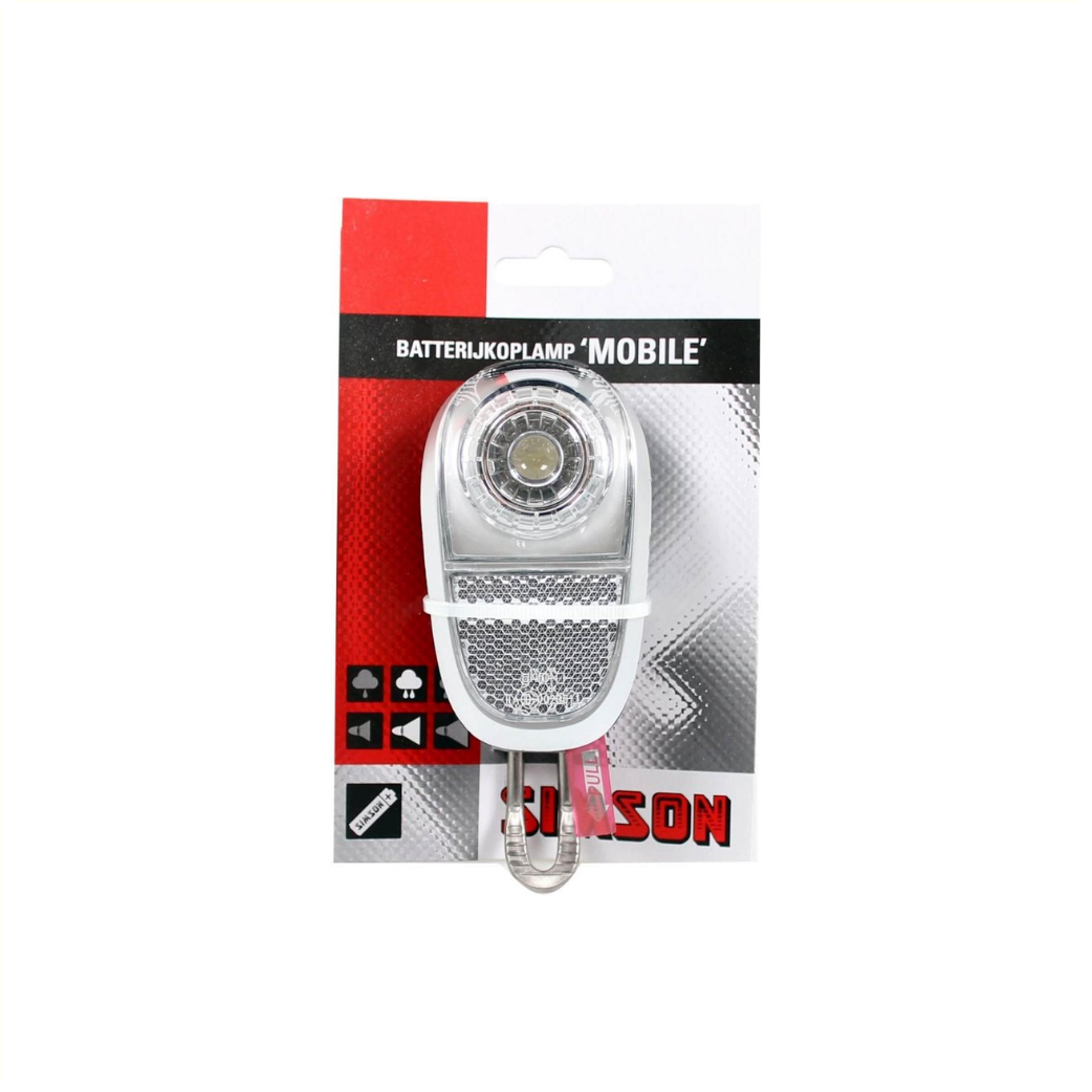 Simson Battery Front Fork Headlight with white LED and on/off button. The headlight has a light output of 5 Lux. • The headlight is suitable for front fork mounting and is easy to attach to the crown piece of the front fork. • Including lamp hook and batteries: 2 x AAA.
