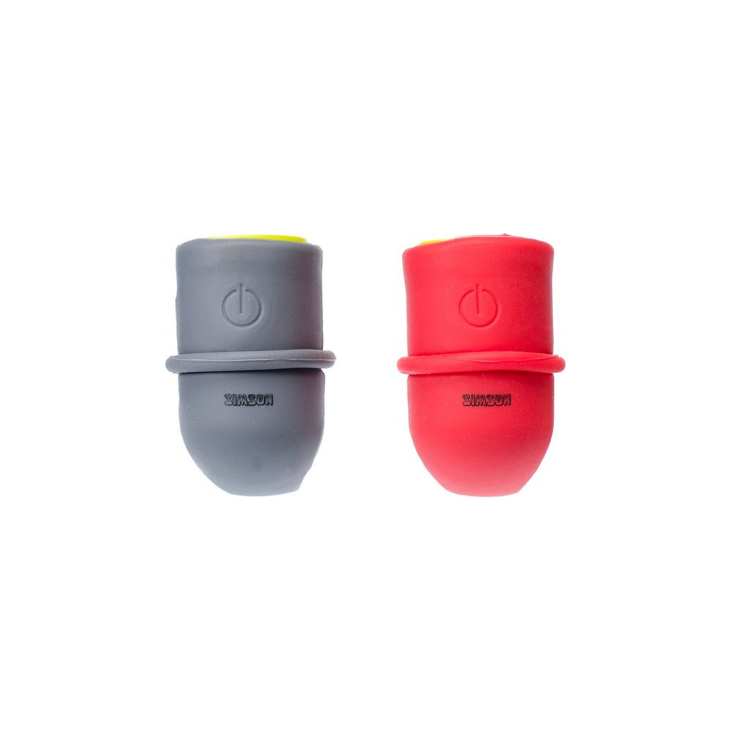 De Simson Batterij LED set "Simmy" heeft een silicone behuizing en een universele siliconen bevestigingsband voor een eenvoudig gebruik op bijvoorbeeld de zadelpen of het stuur.