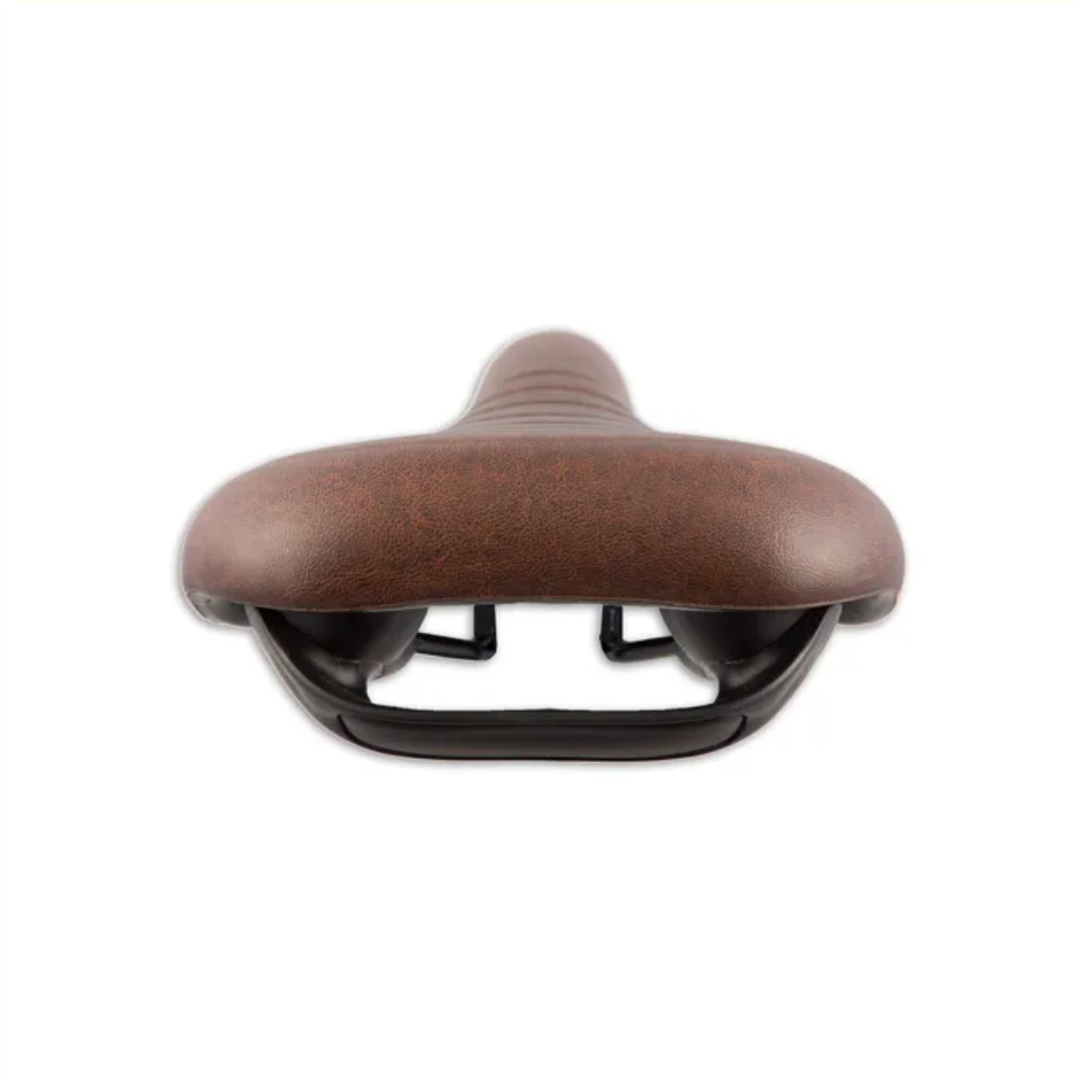 Cette selle E-grip marron foncé d'ABI est idéale pour les vélos électriques. Une poignée à l'arrière facilite le transport des vélos plus lourds, comme les vélos électriques.