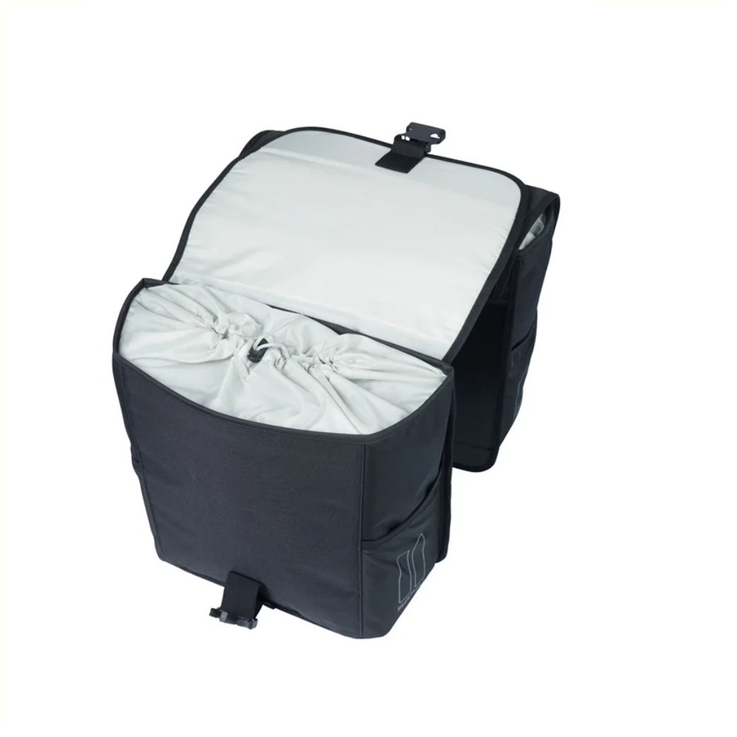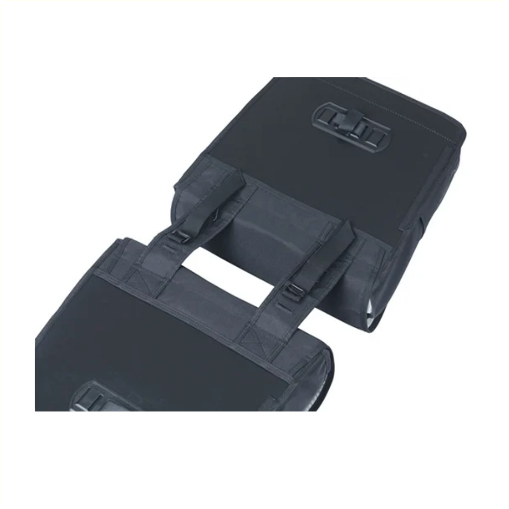 The Basil GO Double Bag is a black double bicycle bag for the back, perfect for people who travel a lot by bike. A bike ride to the supermarket or a bike ride to that friend, this modern bicycle bag makes your bike ride easier and more fun. The bag can be closed with a drawstring and click closure. There are two adjustable straps, so there is room for quick-release fasteners, a child seat, spring clamp or luggage carrier. The elastic side pockets offer space for a bottle of water or (if necessary) an umbrella. The sturdy bag is made of high-quality material and has a capacity of no less than 32 liters. So you have enough space for groceries, your sportswear or other necessities. You can easily attach the bag to your luggage carrier (also e-bikes). The reflective details ensure that you are more visible in the dark. • Polyester 900D